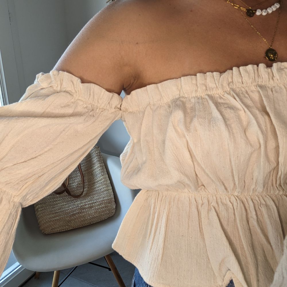- Design : Blouse avec décolleté bateau et manches longues élastiques en couleur écru